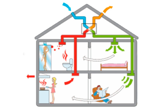 Mediante una máquina y una red de conductos hacia el exterior y las diferentes estancias, se precalienta el aire limpio entrante antes de expulsar el aire viciado.